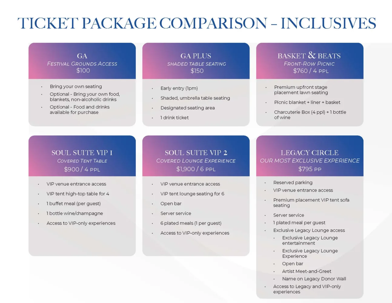 Our most exclusive offering, featuring private lounge access, open bar, and additional entertainment in an intimate setting designed for the Legacy Circle and Corporate Sponsor guests who want a premium experience.